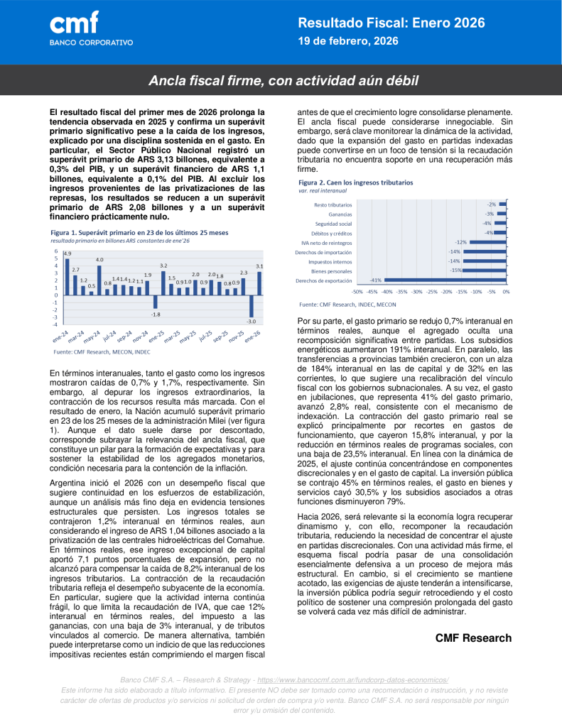 Ancla fiscal firme, con actividad aún débilPor Belen Eliana Castillo / febrero 19, 2026 Te invitamos a leer el nuevo informe de Datos Económicos – Resultado Fiscal enero 2026 elaborado por nuestros Analistas de Research. DESCARGAR INFORME