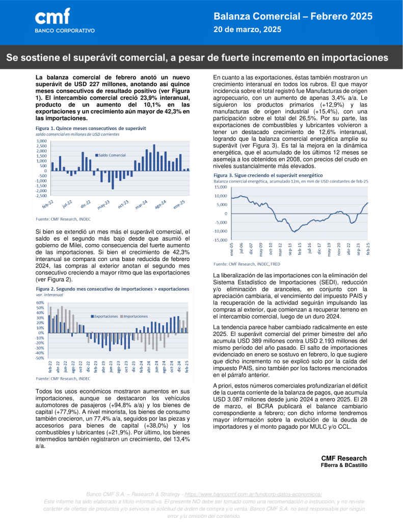 Se sostiene el superávit comercial, a pesar de fuerte incremento en importaciones March 20, 2025 View report