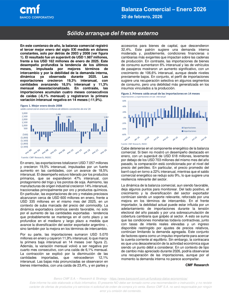 Sólido arranque del frente externoPor Belen Eliana Castillo / febrero 20, 2026 Te invitamos a leer el nuevo informe de Datos Económicos – Balanza Comercial de enero 2026 elaborado por nuestros Analistas de Research. DESCARGAR INFORME