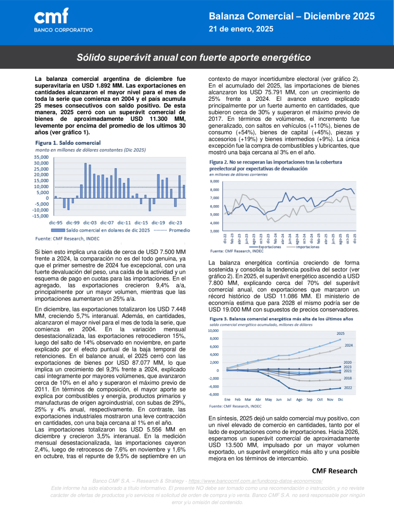 Sólido superávit anual con fuerte aporte energéticoPor Belen Eliana Castillo / enero 21, 2026 Te invitamos a leer el nuevo informe de Datos Económicos – Balanza Comercial de diciembre 2025 elaborado por nuestros Analistas de Research. DESCARGAR INFORME